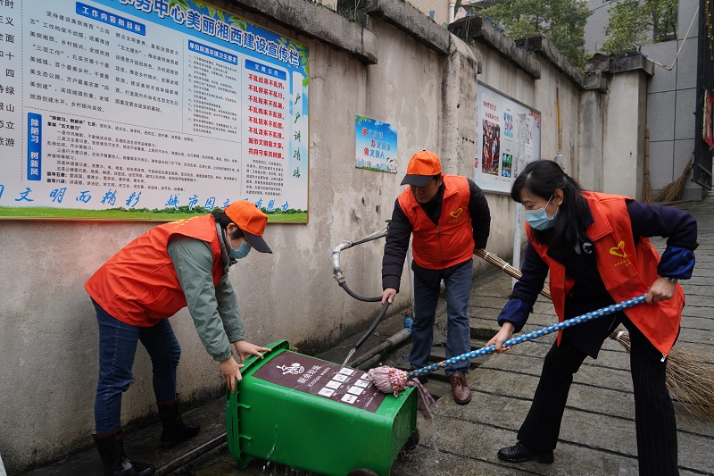 拿个拖把过来,这个大垃圾桶得好好清洗一番。”“这个阴沟长年潮湿,我们多喷点84消毒液。”志愿者们面戴口罩,手拿扫把、抹布等工具,20余人认真清洗着临街面栏杆,打扫院内的树叶、杂草和垃圾,大到生活垃圾桶、宣传栏,小到瓜子壳、广告牛皮癣,每一个人都尽心尽力,不放过任何一个死角……大家分工明确、相互协作,整整一个上午,全面清除了各个卫生死角。