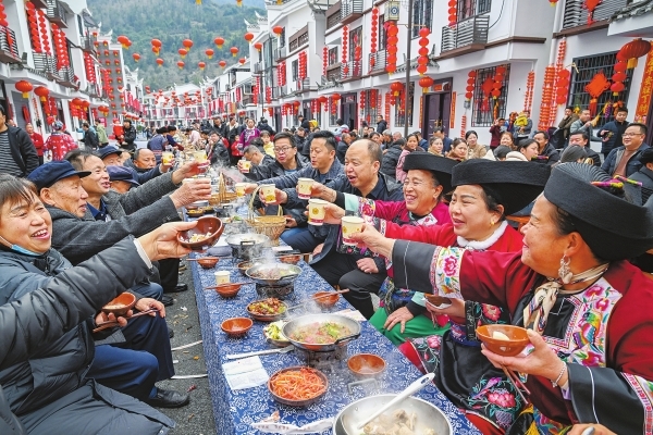 3月3日,农历正月十五,吉首市大兴寨水库移民矮寨安置区举行“金马迎春花灯俏 移民新寨庆团圆”联欢活动,移民群众欢聚一堂吃长桌盛宴,庆祝元宵佳节。