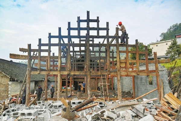 2025年3月16日,吉首市矮寨镇吉龙村,施工人员对移民群众的旧木房进行拆除。