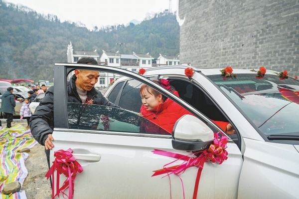 1月31日,吉首市大兴寨水库移民矮寨安置区,原聚福村移民施兴旺和妻子龙银金搬入新家后补办婚礼。