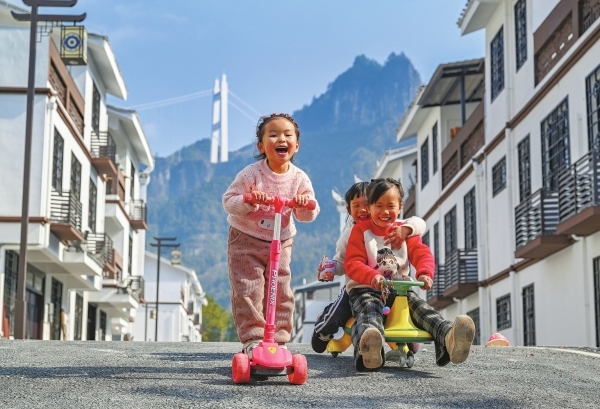 1月23日,吉首市大兴寨水库移民矮寨安置区,小朋友在新家门口开心玩耍。