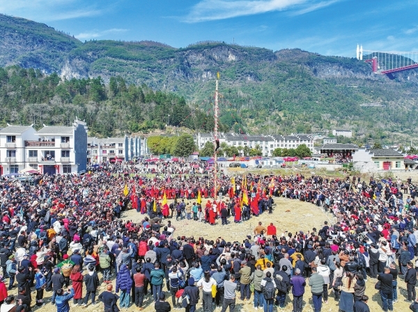 2月20日,吉首市大兴寨水库移民矮寨安置区,上刀梯、苗鼓、苗歌等苗族传统民俗轮番上演,新春年味别样浓。