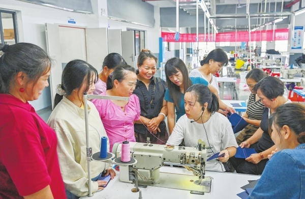2025年6月29日,吉首经开区箱包电子产业园,大兴寨水库移民学员在湖南亿方智能箱包有限公司接受岗前(缝纫车工)技能培训。